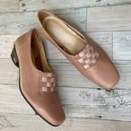 ゴムと革を編み込んで、市松模様を表現したスクエアトゥパンプス。